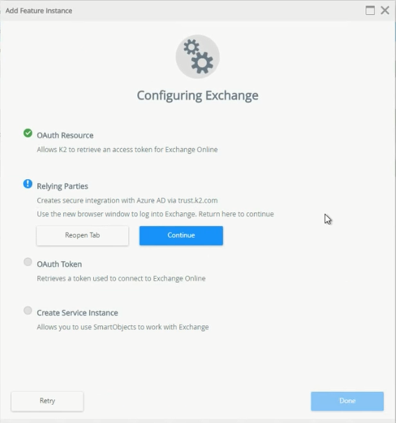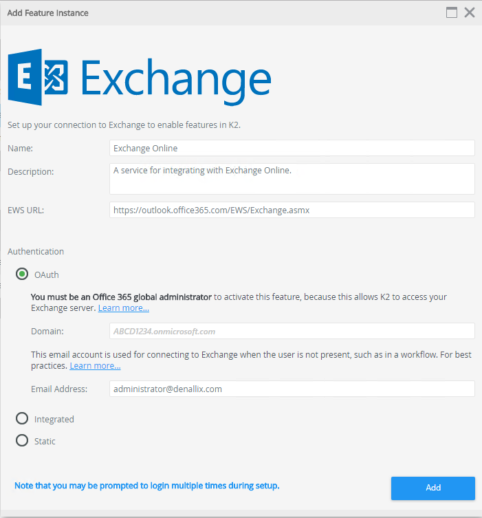 2. The Exchange instance created by this feature is not linked to any K2 wizards. All Exchange wizards use the Exchange service types configured at time of installation.