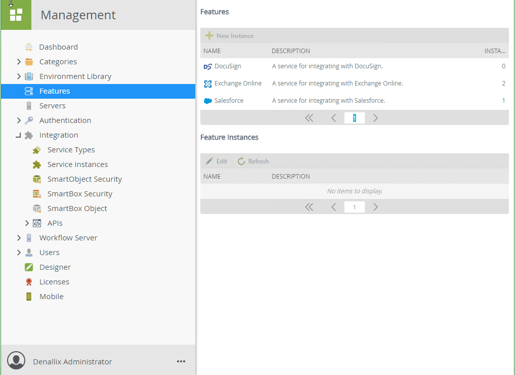 The Features node contains a list of Features that are available in your environment. From here, you can enable various features in your K2 environment, such as integration with third-party systems like DocuSign. Typically, activating a feature in a K2 environment will make available wizards and SmartObjects that allow application designers to integrate with various systems.
