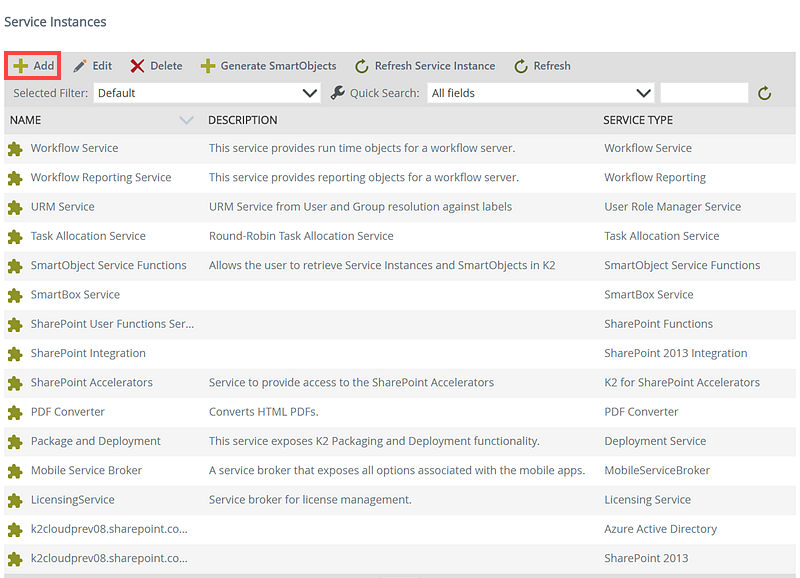 - Click Add from the Service Instances view.