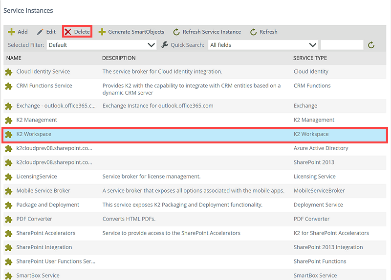 SmartObjects Generate SmartObjects for this Service Instance Select the check box if you want to automatically generate SmartObjects for the new Service Instance. (Whether this check box is selected or not, designers can still create SmartObjects for the underlying system manually using K2 Design tools). - Click OK to register the new Service Instance after providing the necessary values. It may take a few seconds for this operation to complete, since K2 may be performing discovery operations against a large set of entities, and/or generating and publishing SmartObjects, if the Generate SmartObjects option was selected.