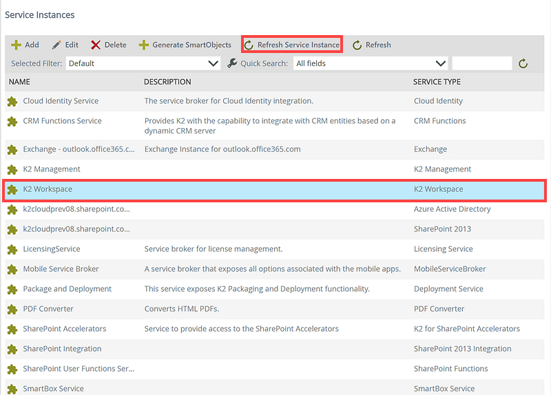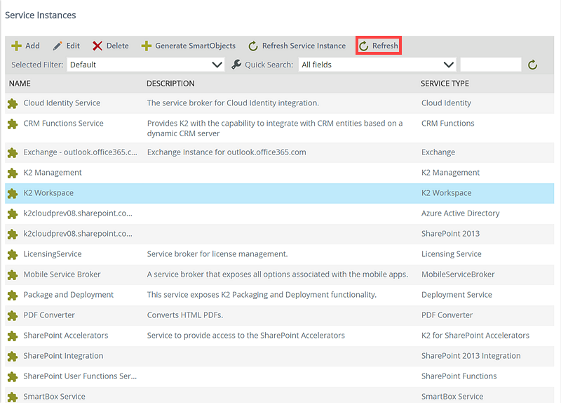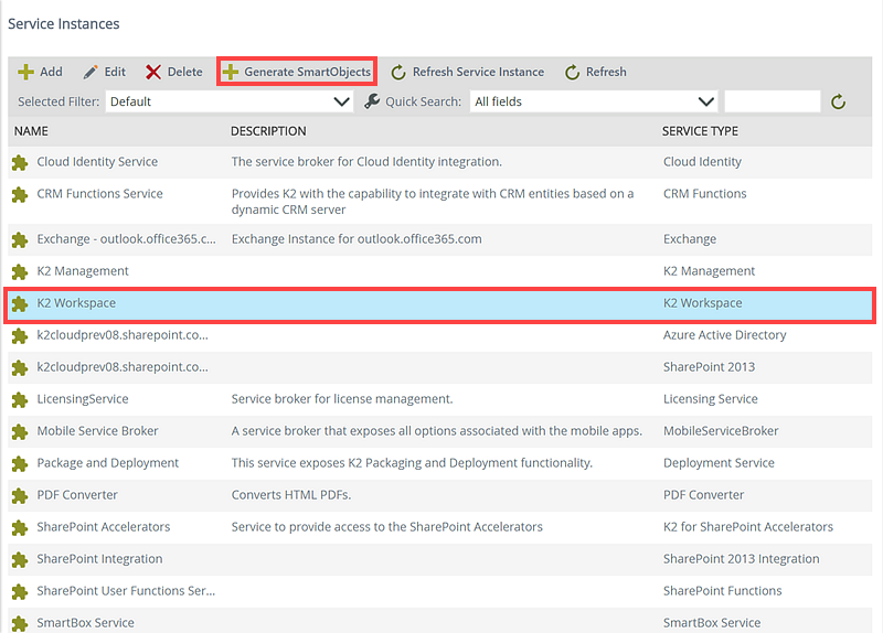 You can tell K2 to automatically generate and publish SmartObjects for a Service Instance. If you have refreshed a Service Instance, you can use this button to generate SmartObjects for any new or changed artifacts in the underlying system. Note that designers will still be able to use K2 design tools to manually create SmartObjects that use the Service Instance, regardless of whether you have generated SmartObjects or not.