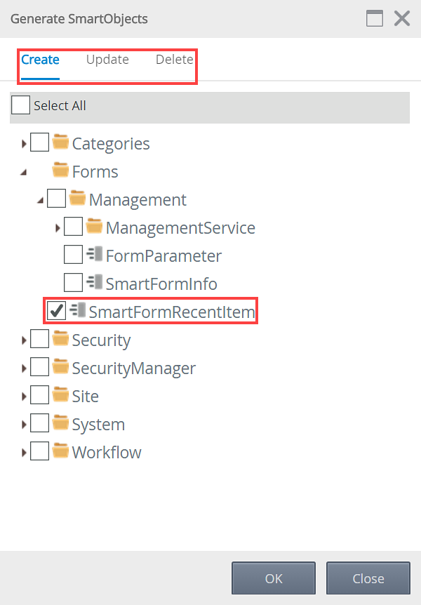 - The Generate SmartObjects screen will open. Select the required SmartObject you wish to create, update or delete.