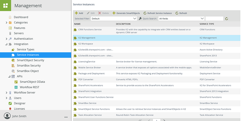 Clicking on the Service Instances node displays a list of the registered Service Instances in your environment. You can create, edit and delete instances. You can also generate SmartObjects for an instance, refresh an instance or refresh the instances list.