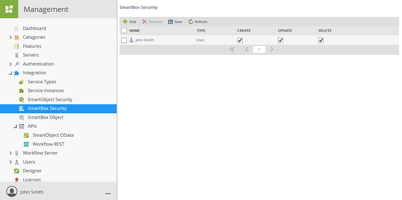 Follow these steps to add design-time permissions that will determine which users/groups can execute particular methods for SmartBox-backed SmartObjects: