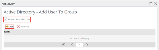 - On the Add Security page, check the Restrict Wizard Access check box. To add users who will have access to the wizard, click the Add button.