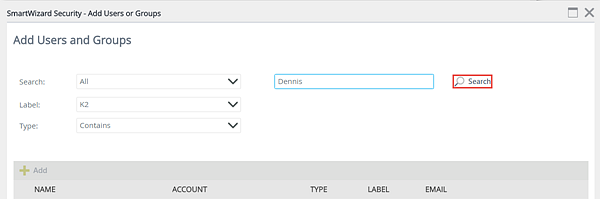 - On the SmartWizard Security - Add Users or Groups page, search for a user or group of users that require access via search functionality. Specify the Search, Label and Type fields, enter the user or group name and click the Search button.