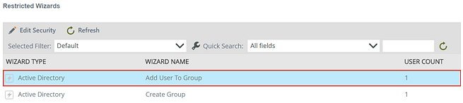 Field/Button Description Add Security Click to add restrictions for the selected wizard. Refresh Refreshes the list of unrestricted and restricted wizards. Wizard Type Displays the type of wizard available for restriction. Wizard Name Displays the name of the wizard. Edit Security Edit or remove wizard restrictions. User Count Displays the number of users or groups that have access to a specific restricted wizard.