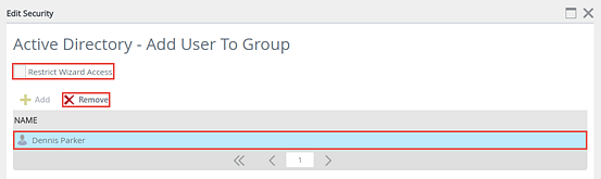 - On the Edit Security page uncheck the Restrict Wizard Access check box. Select the user or group that was given access to the wizard and click the Remove button.