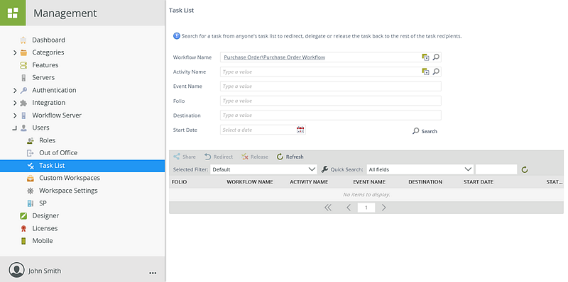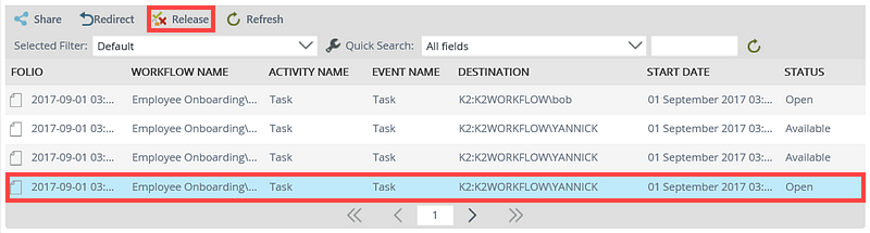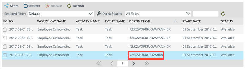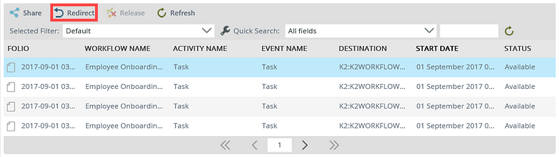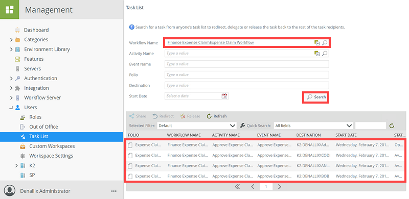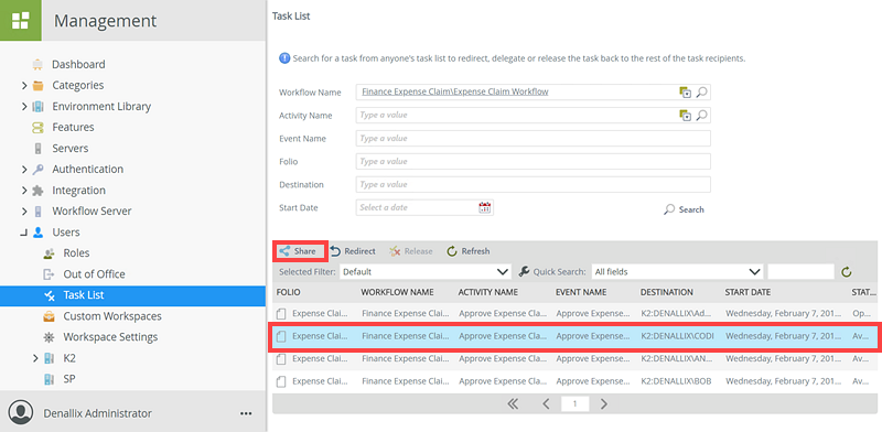 The Task List node displays a list of all K2 tasks (also called "Worklist Items" or "Task List Items") for users. From this page, you can search, share (delegate), redirect or release worklist items.