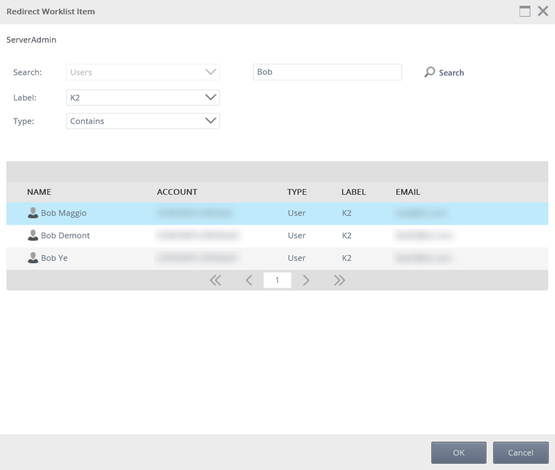 - The Redirect Worklist Item page opens. Use this page to search for the user that you want to redirect the Worklist Item to.