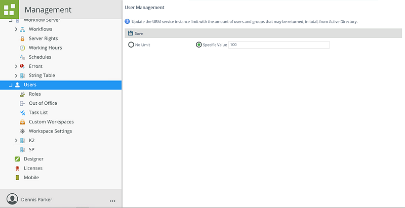 On the User Management landing page, you can also configure some settings related to the User Role Manager (URM) service, for example limiting the amount of users and groups that are returned from Active Directory.