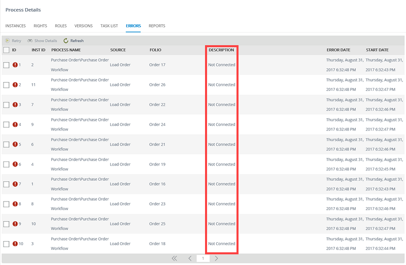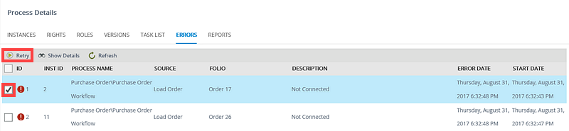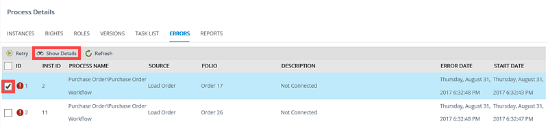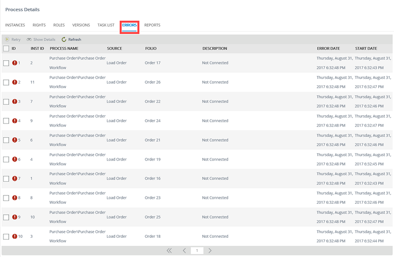 The Errors tab in the Process Details screen allows a administrator to view, retry, show details and refresh instances of the currently selected workflow that are in Error state