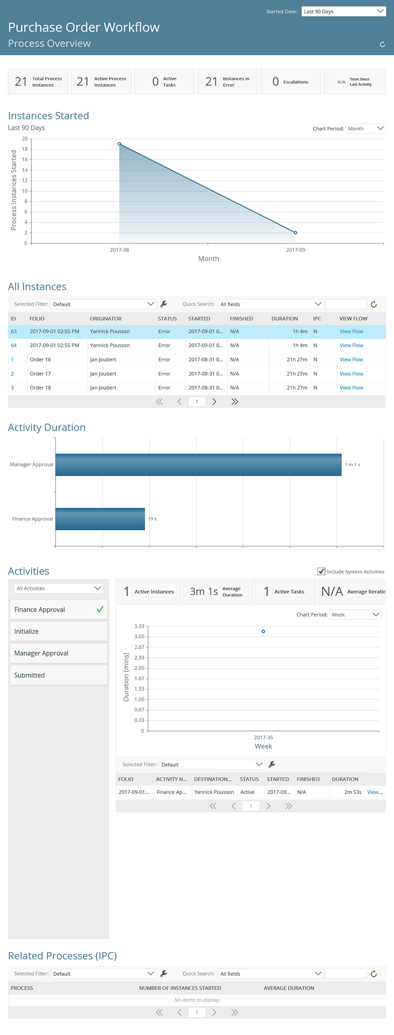 Related Processes (IPC) | Displays a item list of all related processes (IPC) of a process by Process, Number of Instances Started and Average Duration. The data returned is specified by the Started Date. The returned data can be further filtered via the Quick Search and configuring a Selected Filter. |
