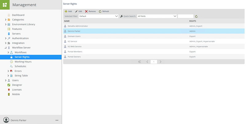 The Server Rights node is used to add, edit, remove and refresh Workflow server permissions for users or groups. These rights will determine which users and groups can administer a K2 workflow server, export new workflows or impersonate a user.