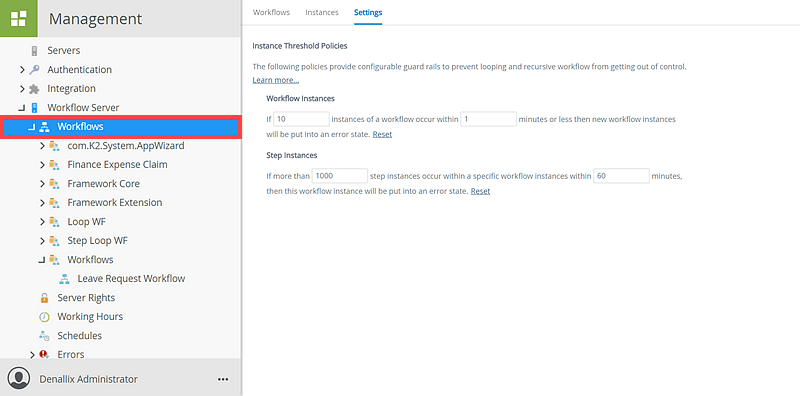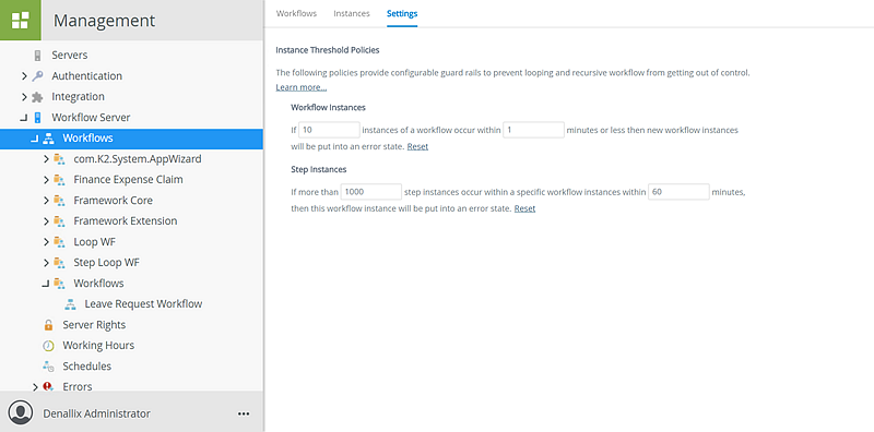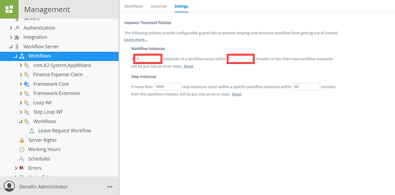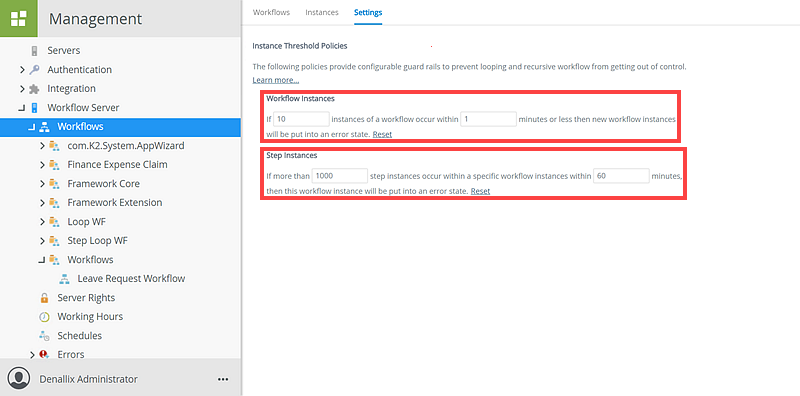 - The Workflow Instances option allows you to configure a policy setting that, if a certain amount of workflow instances are started within a certain amount of time (in minutes), then any new instances are put into error state.