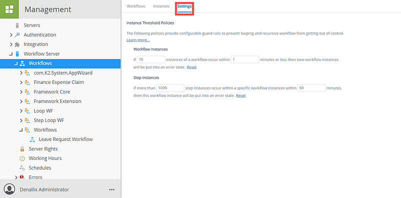 The Settings tab allows you to configure and manage Instance Threshold Policies on all workflows in your environment. Instance Threshold Policies help prevent looping and recursive workflows from entering a loop state and causing server performance degradation.