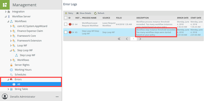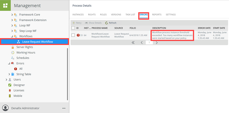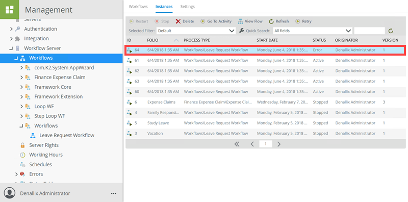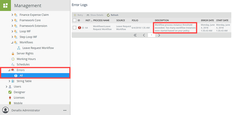 - When any workflow on the server exceeds this policy, new instances are placed in to error state . The Leave Request Workflow exceeded the Workflow Instances option of the policy and the instance that exceeded the policy went in to error state. The first four instances executed successfully but the fifth instance went into error state as per the policy.