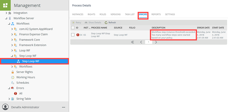 Workflow process instance threshold exceeded. Too many workflow instances were started based on your policy. - If a Step Instance option of a policy is exceeded, you can view the error in the Errors > All node or in the Errors tab on the Process Details page of the workflow. The following error is displayed: