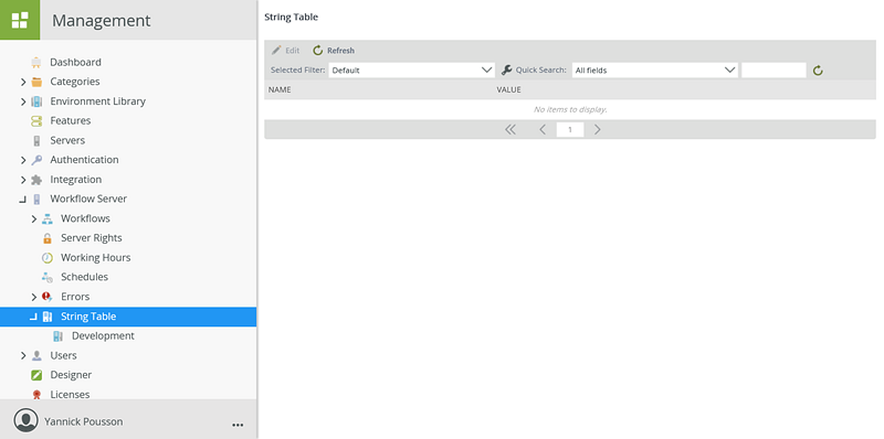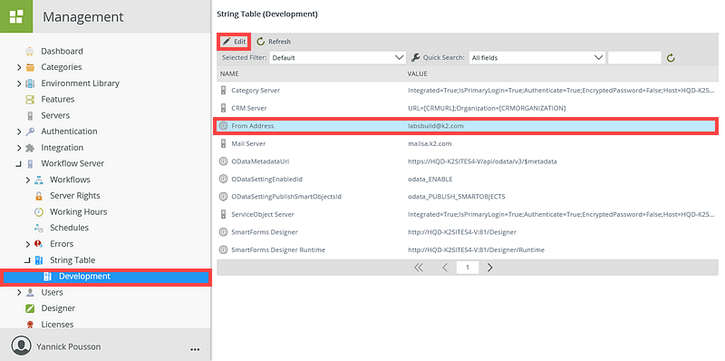 String Table entries are automatically updated whenever a K2 workflow is deployed, using the field values specified in the targeted Environment Library. To avoid confusion and conflicting changes, we recommend that you define and maintain any variables/placeholders in the Environment Library, and rely on the workflow deployment mechanism to keep the String Tables updated. It is not recommended to add or edit values in the String Table, unless it is done for backward compatibility with older workflows that do not rely on Environment Fields.