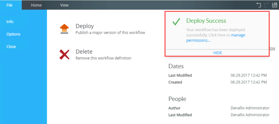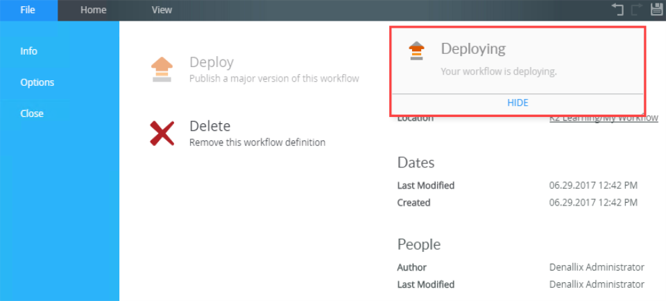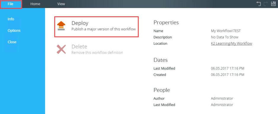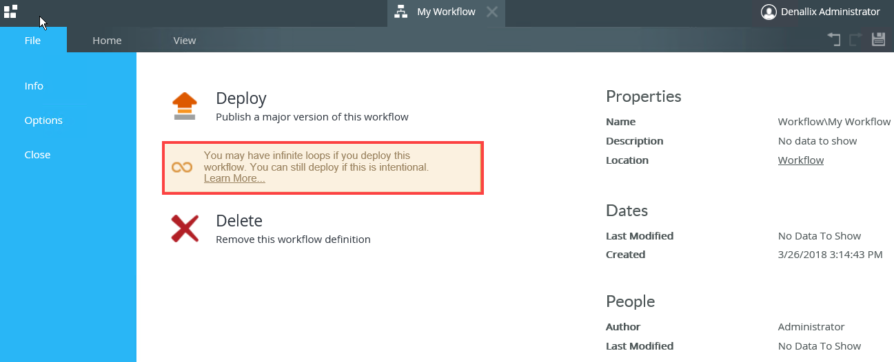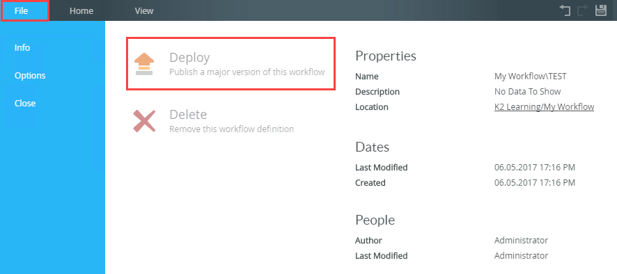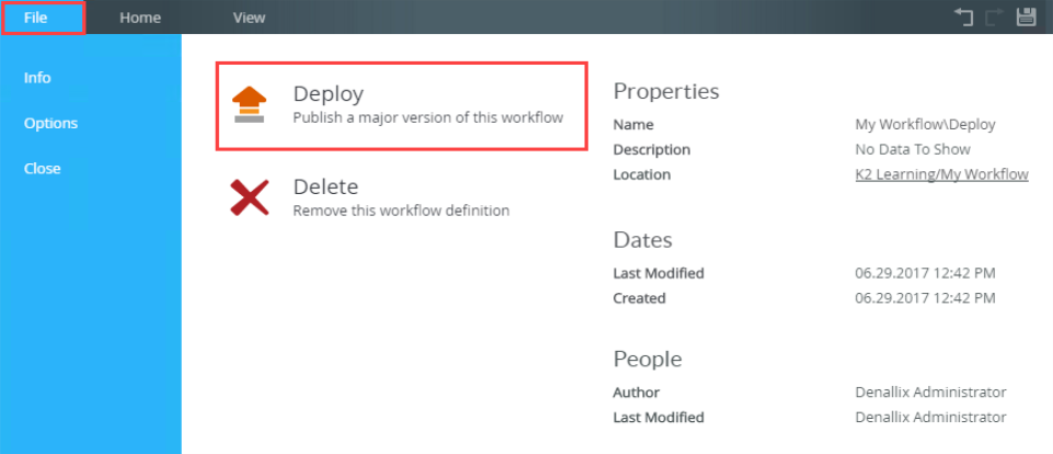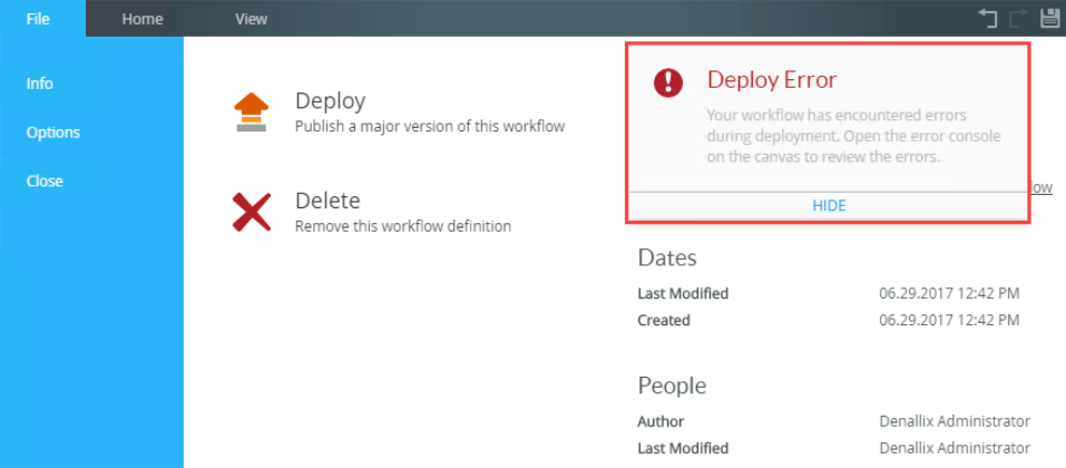 - To return to your workflow, click the File tab. Fix any errors and try deploying your workflow again.