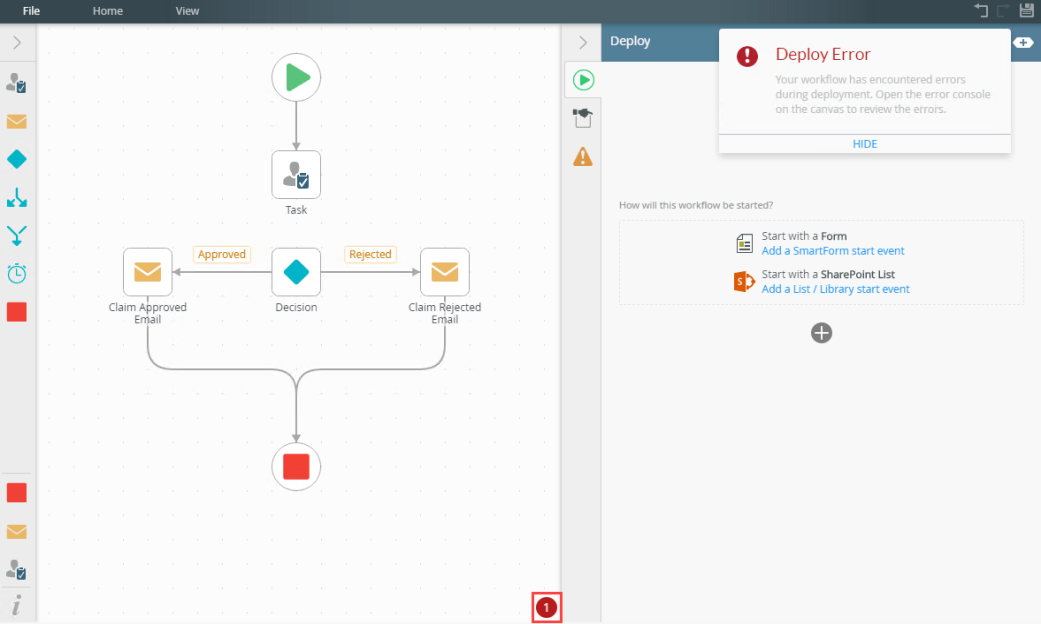 - To see why the deployment failed, you must go to the Error Console. To do this, click the File tab to view the canvas. The error indicator in the lower right shows one deployment error.