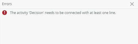 - Click the red error indicator located at the bottom right of the canvas. The error message details open, giving you a description of the deployment error. In this example, the deployment failed due to a missing line from the Task to the Decision step.