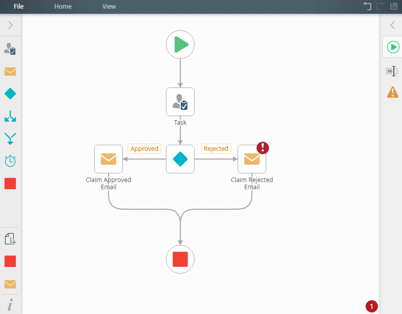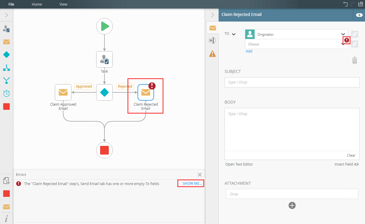 - You are prevented from deploying your workflow if one or more of the step dependencies are missing or are not configured correctly. Click File to return to your workflow. Notice the error on the Claim Rejected Email step. You can use the Error Console to locate existing errors. In this example, the recipient was not configured.