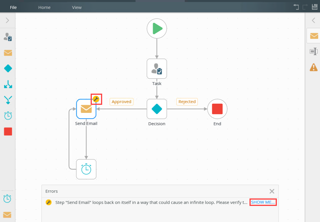 - This message indicates that your workflow contains events that loop back on each other and could cause the workflow to get stuck in a loop at runtime, potentially causing performance degradation on your server. Click File to return to your workflow. Use the Error Console to locate the infinite loop. In this example the loop is on the Send Email step.