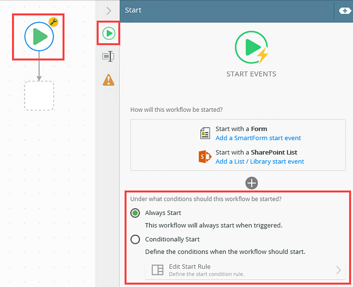 Sometimes you don't want a workflow to start unless it meets certain conditions. In these cases, you use a Conditional Start Rule which allows you to add conditions in a rule to either start or not start the workflow. The Conditional Start Rule evaluates data outside of the workflow and, based on the outcome, either starts the workflow or not.
