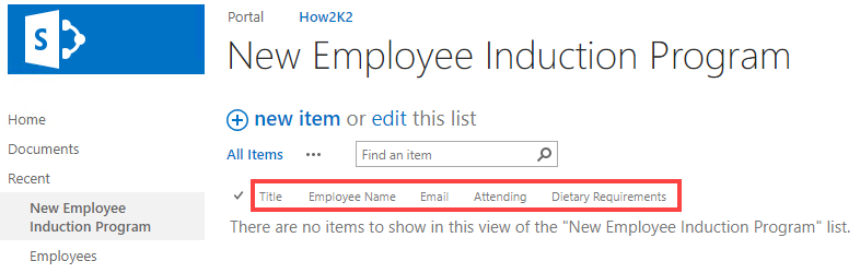 - Create the New Employee Induction Program list in SharePoint as shown below. This list stores employee details.