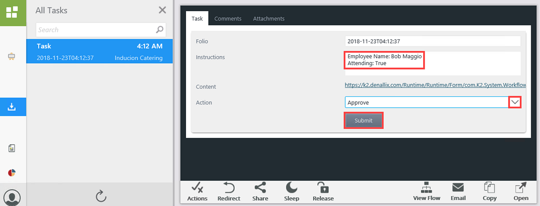 - Adding the new item starts the Induction Catering workflow and a task is sent to the HR representative. In this case it was sent to the Administrator. As Administrator, open K2 Workspace to view the task. Notice the instructions are populated with the employee name and attendance detail. In this case the employee is Bob Maggio and he will be attending. From the Action drop down select Approve and click Submit.