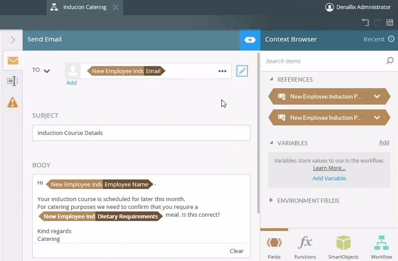 - You now need to reconfigure each of the referenced properties in both the Task and Send Email step. To do this, delete the property and then add it back by dragging it from the reference in the Context Browser. In this example, you remove and add the Employee Name and Attending properties on the Task step.