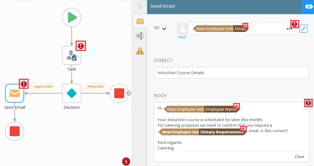- Drag a Send Email step onto the canvas as the outcome to the approved path. Use the New Employee Induction Program reference to configure the To email address and the Body of the email as shown below.