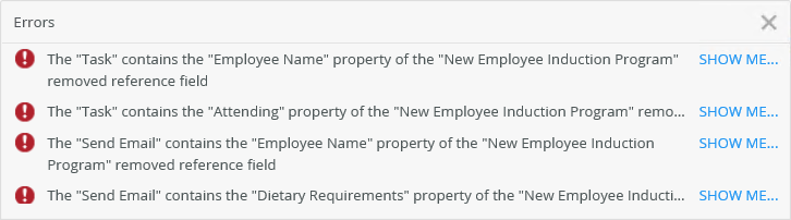 - The error console opens. In here you find a description of the errors and on which step they occurs. In this example, the Employee Name property in the Send Email step has a removed reference field.