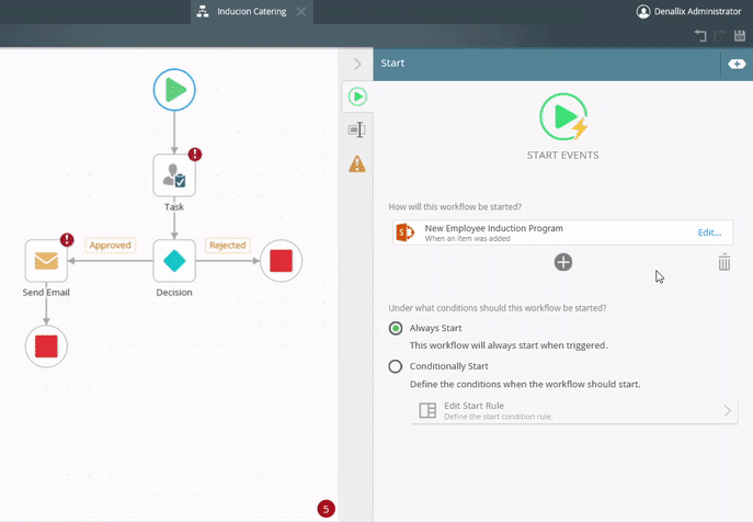 To recreate the reference, reconfigure the New Employee Induction Program SharePoint list event on the Start step.