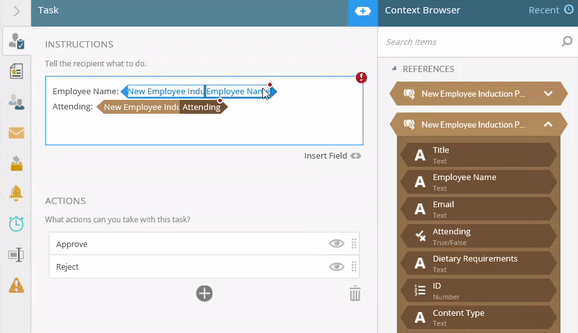 - Drag the Task step onto the canvas. Add Approve and Reject as the task actions. From the Context Browser panel, expand the New Employee Induction Program references. Locate Employee Name and Attending properties from the reference and configure the Instructions as shown below.