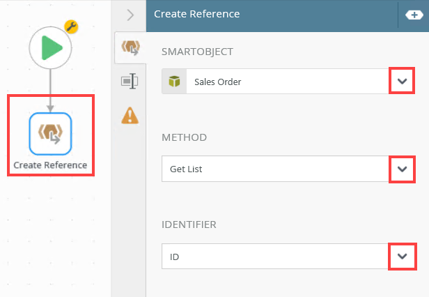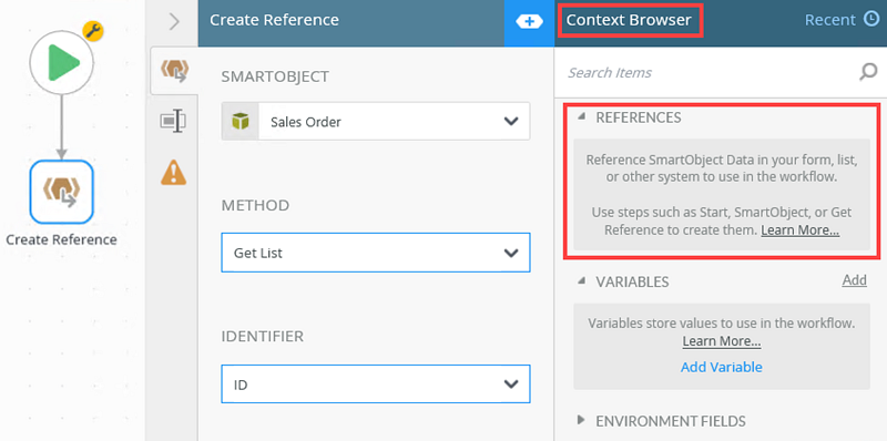 In this example, you add a Create Reference step to your workflow and configure the Sales Order SmartObject Get List method.