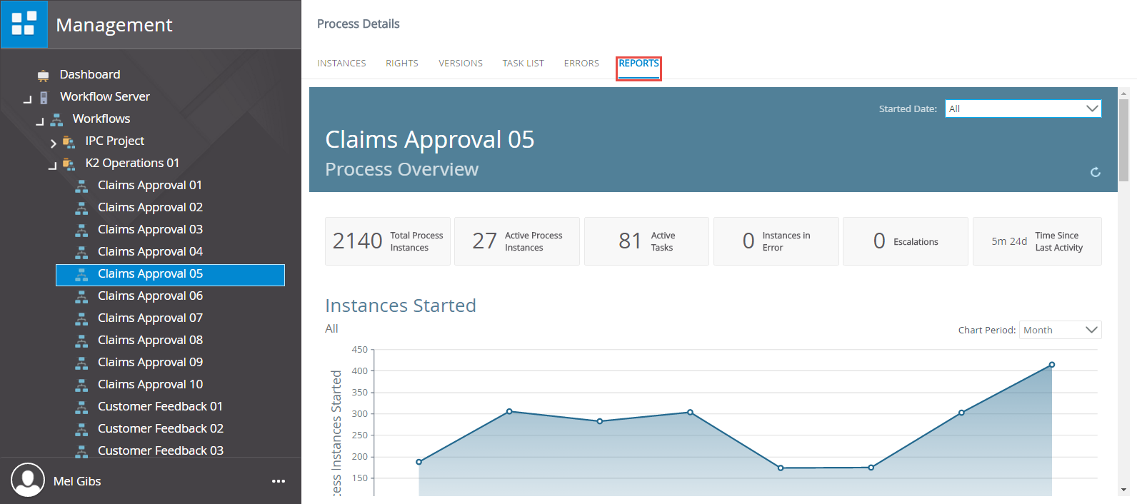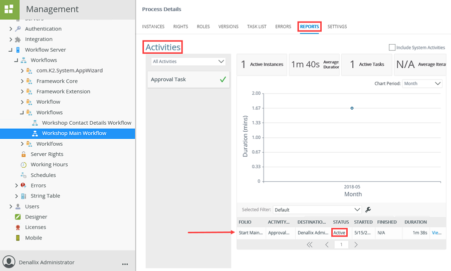 - From the Workshop Main Workflow Process Details click the Reports tab. To view the active instance, scroll down to the Activities section of the report.