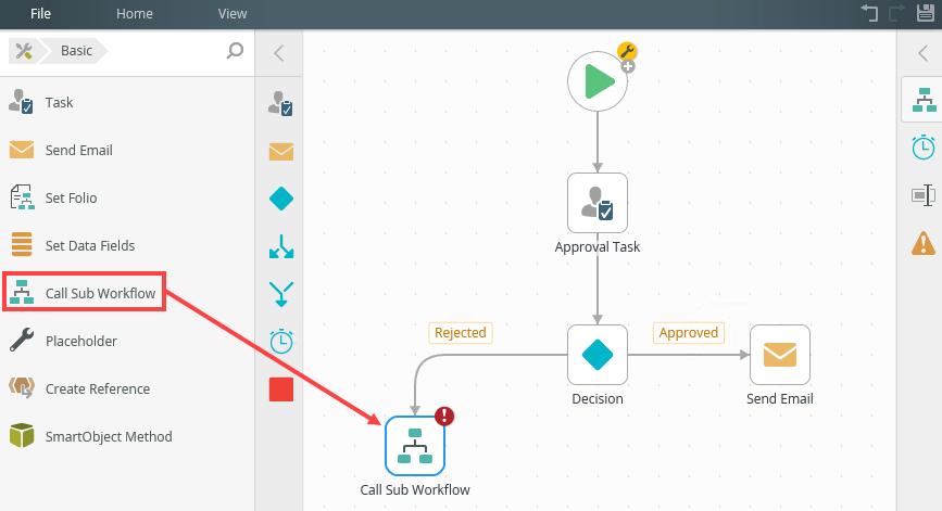 - From the Toolbox click the Basic category and then drag the Call Sub Workflow step onto the canvas.