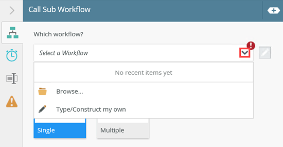 How many workflows? | Use this section to specify how many sub workflows you want to start from within the current workflow. You can use the Select from the following: By default, the Single tile is selected. | Click to select one of the tiles. |
