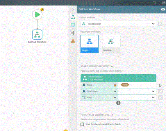 Wait for sub workflow to finish | Allows you to specify if the main (parent) workflow waits for the sub (child) workflow to complete before continuing. By not selecting this option, the main workflow continues to the next step while the sub workflow runs. This is not selected by default. | Check or uncheck the check box. |