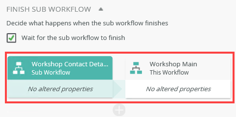 Finish Sub Workflow | Use this to return values from the sub workflow after it has completed. Setup mapping between the sub workflow's fields and the main workflow. Make sure to check the Wait for the sub workflow to finish check box to show the return values in the Finish Sub Workflow section. The return value property mapper shows when this option is selected. | Click the down arrow to open this section. Select properties and supply return values. Click the Add button to add additional property fields. To delete a property select it and click the Trash Bin The Add button is disabled if there are no properties that you can set. |
