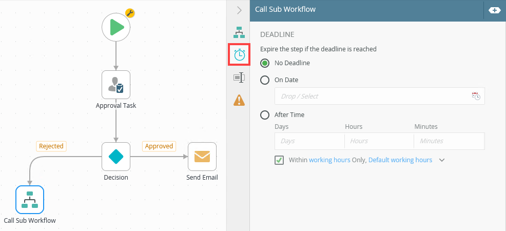 Within Working Hours Only | This function only works when the After Time option is selected. It allows you to set the deadline to happen within working hours. If you select this option, the step expires after the set time within the working hours. If you don't select this option, the deadline does not take working hours into account which may expire your workflow sooner than expected. For instance, if working hours do not include weekends, it could be that the time accumulation over a weekend is used in determining the deadline and then your workflow will be expired a couple days sooner than you may have wanted. Example: You've setup your working hours as Monday - Friday, 8 am - 5 pm. You set up the Call Sub Workflow step to expire after three days, but you do NOT check the Working Hours check box. In this scenario if your sub workflow is triggered on Friday, it would expire three days later on Monday. If you had checked the Work Hours check box it would be three working days, and not expire until Wednesday. To define the working hours for your business, click the working hours link. You need access to K2 Management to set the working hours. For more information on how to set working hours, see the Work Hours topic. The Default working hours drop down menu has a list of working hours defined in K2 Management by a K2 Administrator. If you have not defined any working hours, the Default working hours option is selected. Example: You select the After Time option and specify that the step needs to expire after 30 minutes. You also select this to happen within working hours. The working hours option you select is for the Sales team, which means Monday to Friday 8 am - 5 pm. By default, the Within Working Hours Only option is checked. | Check the Within Working Hours Only box. Click the working hours link to edit or add the working hours parameters. Click the Default working hours drop down menu to select a pre-configured set of working hours. |