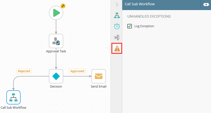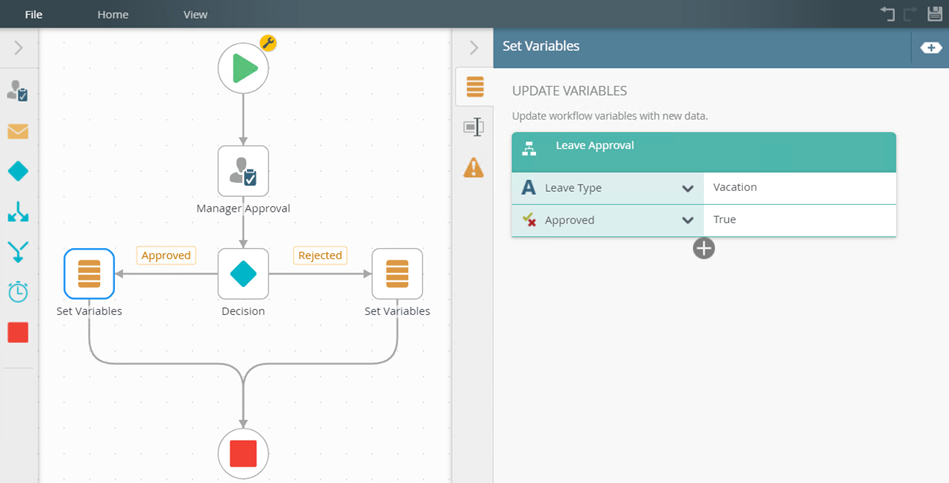 - A Rejected action sets the variable to False. This value is sent to the main workflow