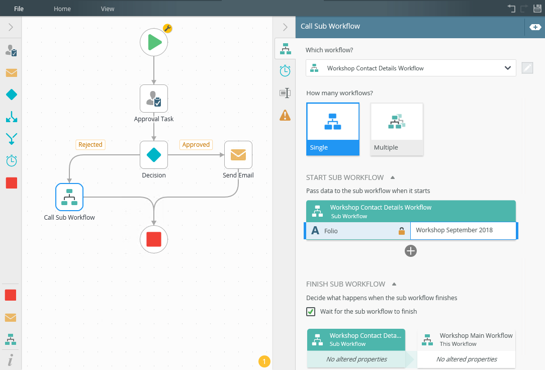 In this example, you work with two workflows called Workshop Main Workflow and Workshop Contact Details. The Workshop Contact Details workflow is added and configured to the Workshop Main Workflow in a Call Sub Workflow step and referred to as the sub or child workflow. This then makes the Workshop Main Workflow the main or parent workflow.
