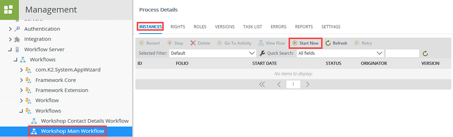 - In this example, start the main workflow (Workshop Main Workflow) from K2 Management site. Click Start New.