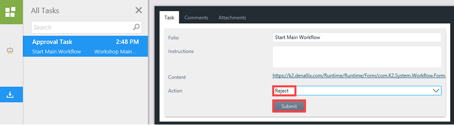 - Open Workspace, and from the Denallix Administrator task list, select Reject and click Submit.