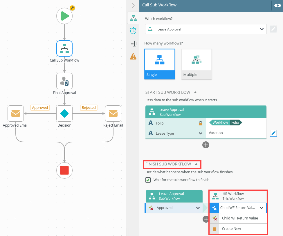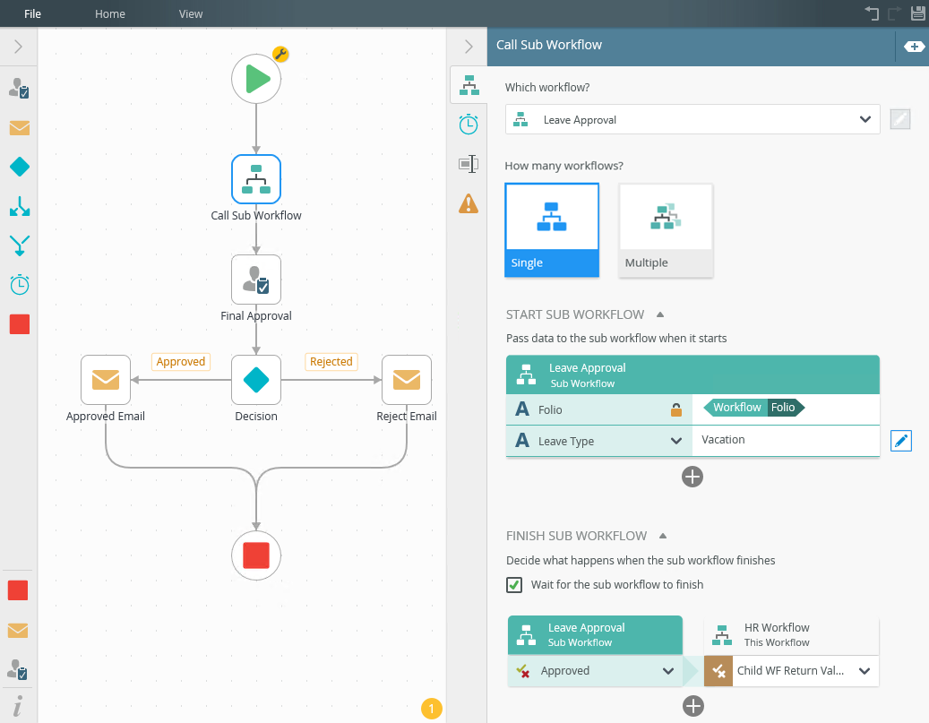 - In this example, the main workflow starts and calls the sub workflow. The sub workflow handles the Manager Approval part of the workflow. The manager approves the leave request and the Approved variable sends a True value back to the main workflow, and the sub workflow ends.