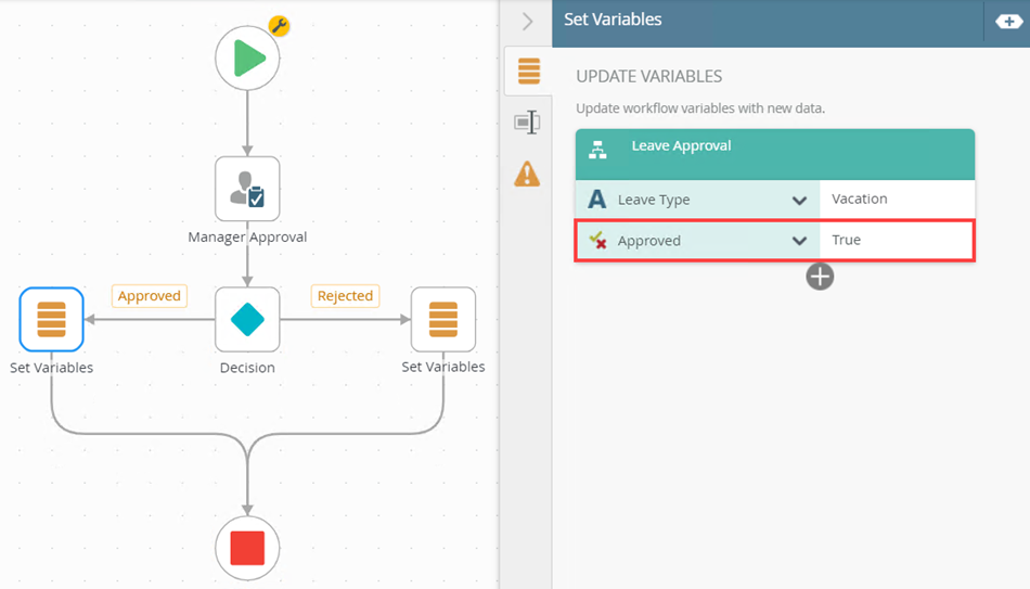 - An Approved action sets the variable to True. This value is sent to the main workflow