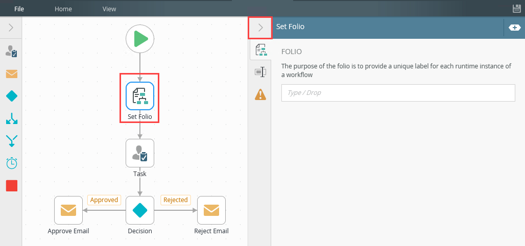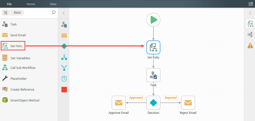 - From the Toolbox click the Basic category, then drag the Set Folio step onto the canvas.